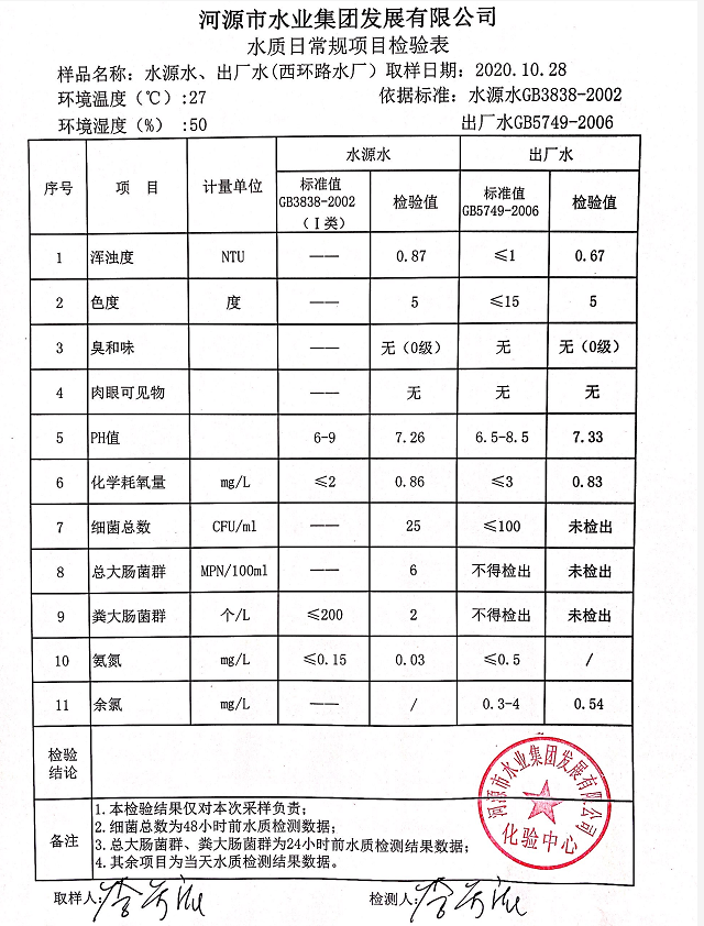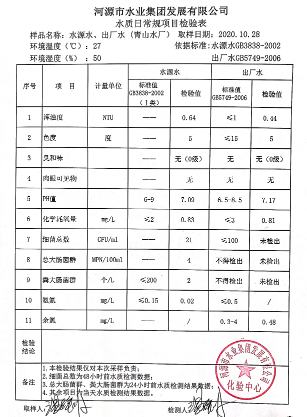 2020年10月27日水质检验报告